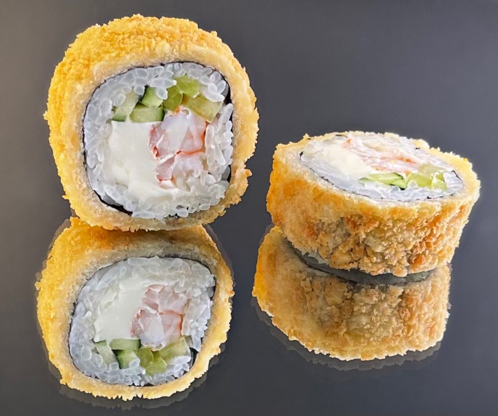 Рис, нори, Тигровые Креветки, сливочный сыр, свежий огурчик, семя кунжута,хрустящая панировка.