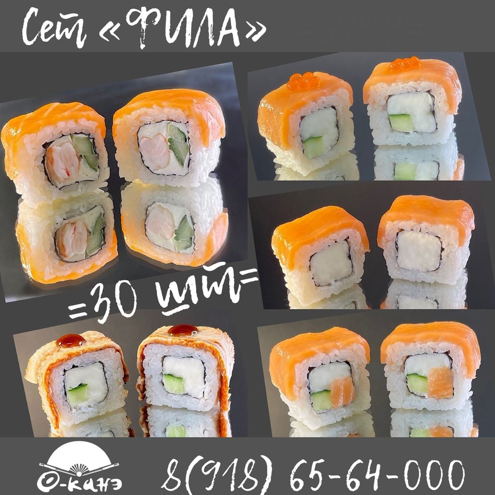 *Фила Классическая -10 шт *Фила Лосось -5 шт *Фила Креветка -5 шт *Фила Икура -5 шт *Фила Угорь -5 шт
