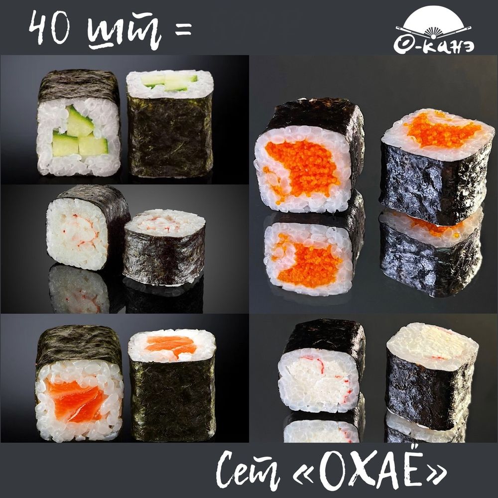 *Ролл Лосось -8 шт *Ролл Креветка -8 шт *Ролл Краб -8 шт *Ролл Масаго -8 шт *Ролл Огурец -8 шт