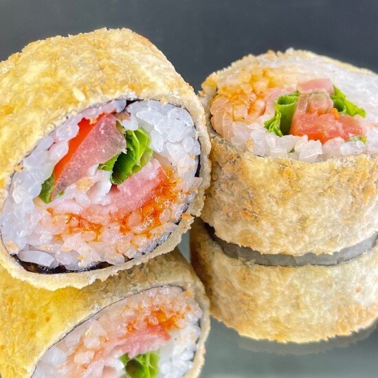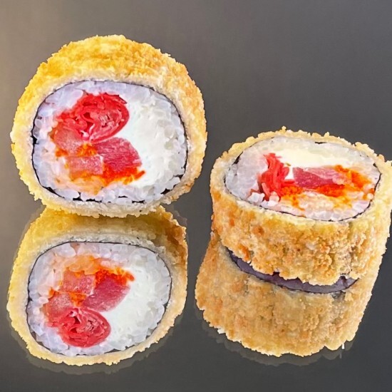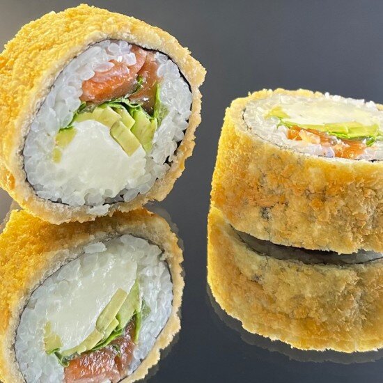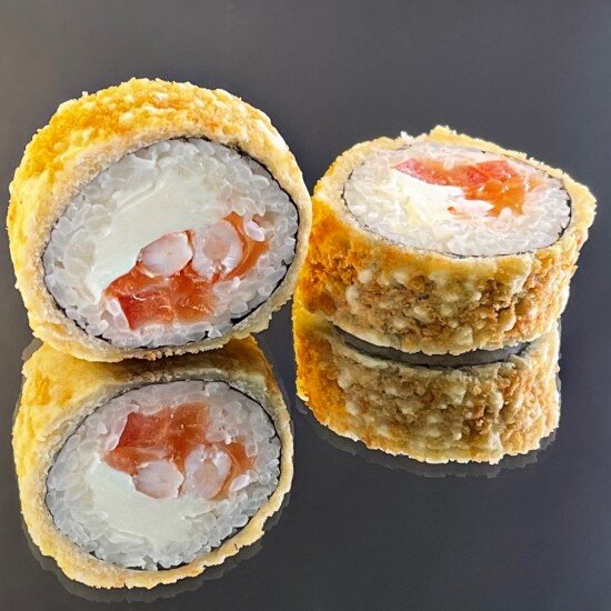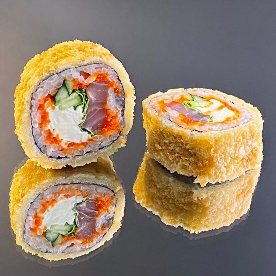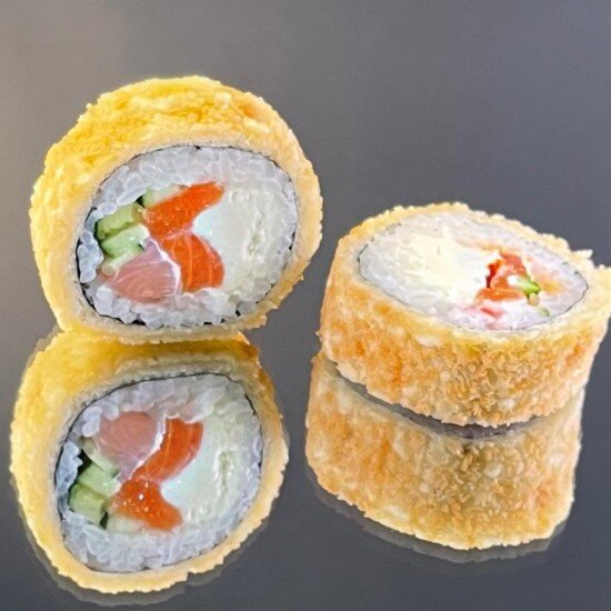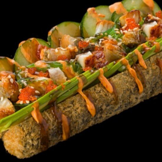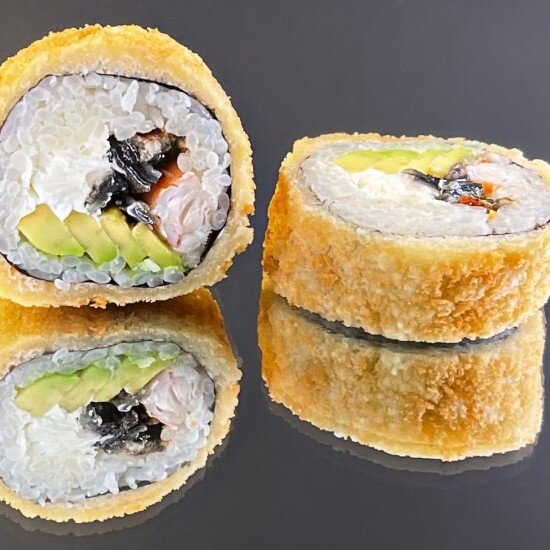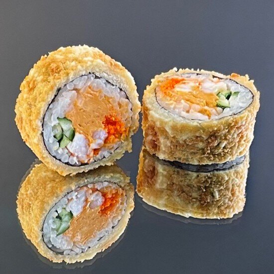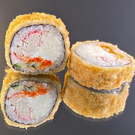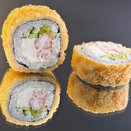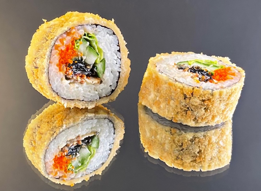 Рис, нори, филе Угря, белый японский соус, свежий огурчик, икра Масаго, mix салата, хрустящая панировка.