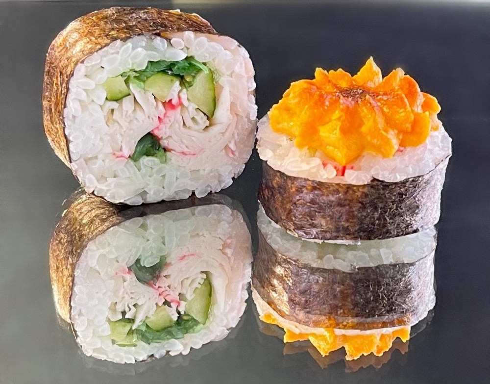 Рис, нори, Снежный краб, Чука, свежий огурчик, сырная шапка.