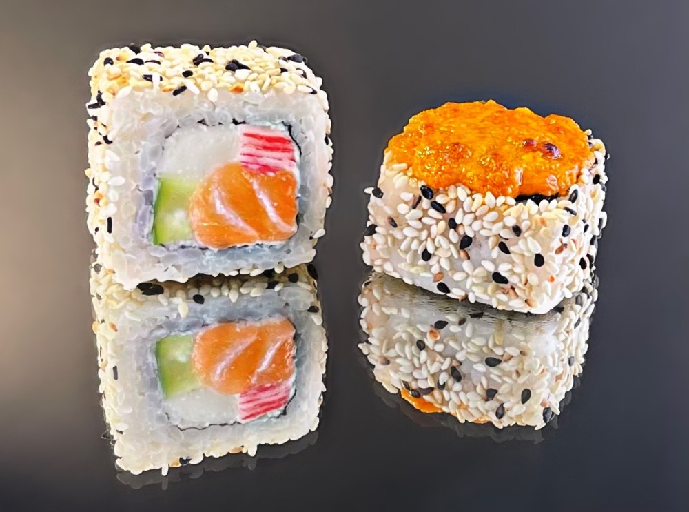 Рис, нори, филе Лосося, Снежный краб, сливочный сыр, свежий огурчик, семя кунжута, сырная шапка.