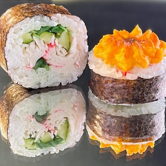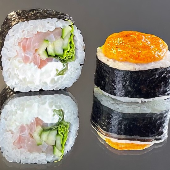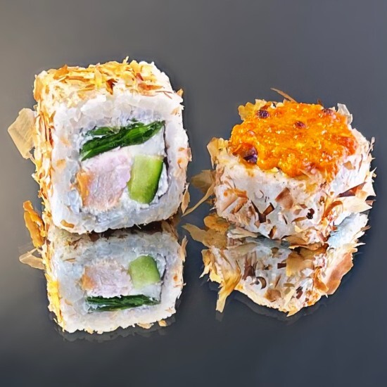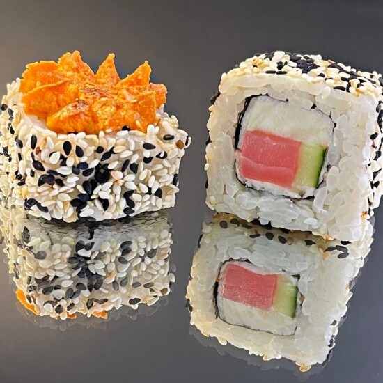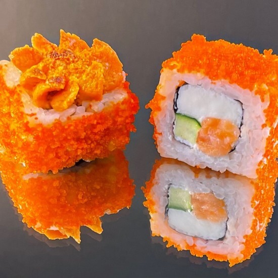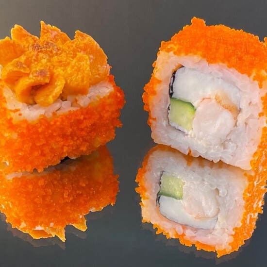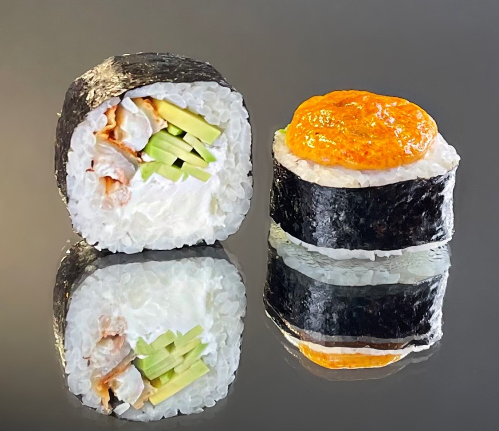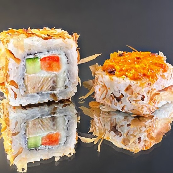 Рис, нори, филе Угря, сливочный сыр, авокадо, соус Спайси.