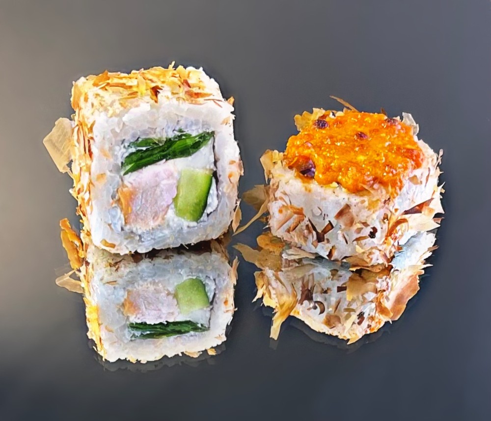 Рис, нори, филе копченой курочки, белый японский соус, свежий огурчик, зеленый лучок, стружка Тунца, сырная шапка.