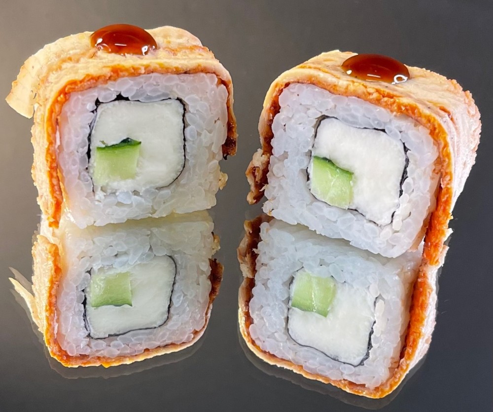 Рис, нори, филе Угря, сливочный сыр, свежий огурчик, соус Унаги, семя кунжута.