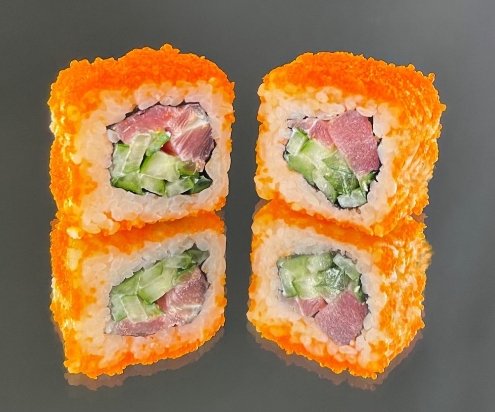 Рис, нори, филе Тунца, белый японский соус, свежий огурчик, икра Масаго.