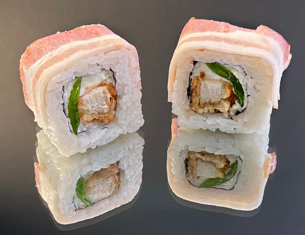 Рис, нори, сливочный сыр, филе жареной курочки, зеленый лучок, бекон.