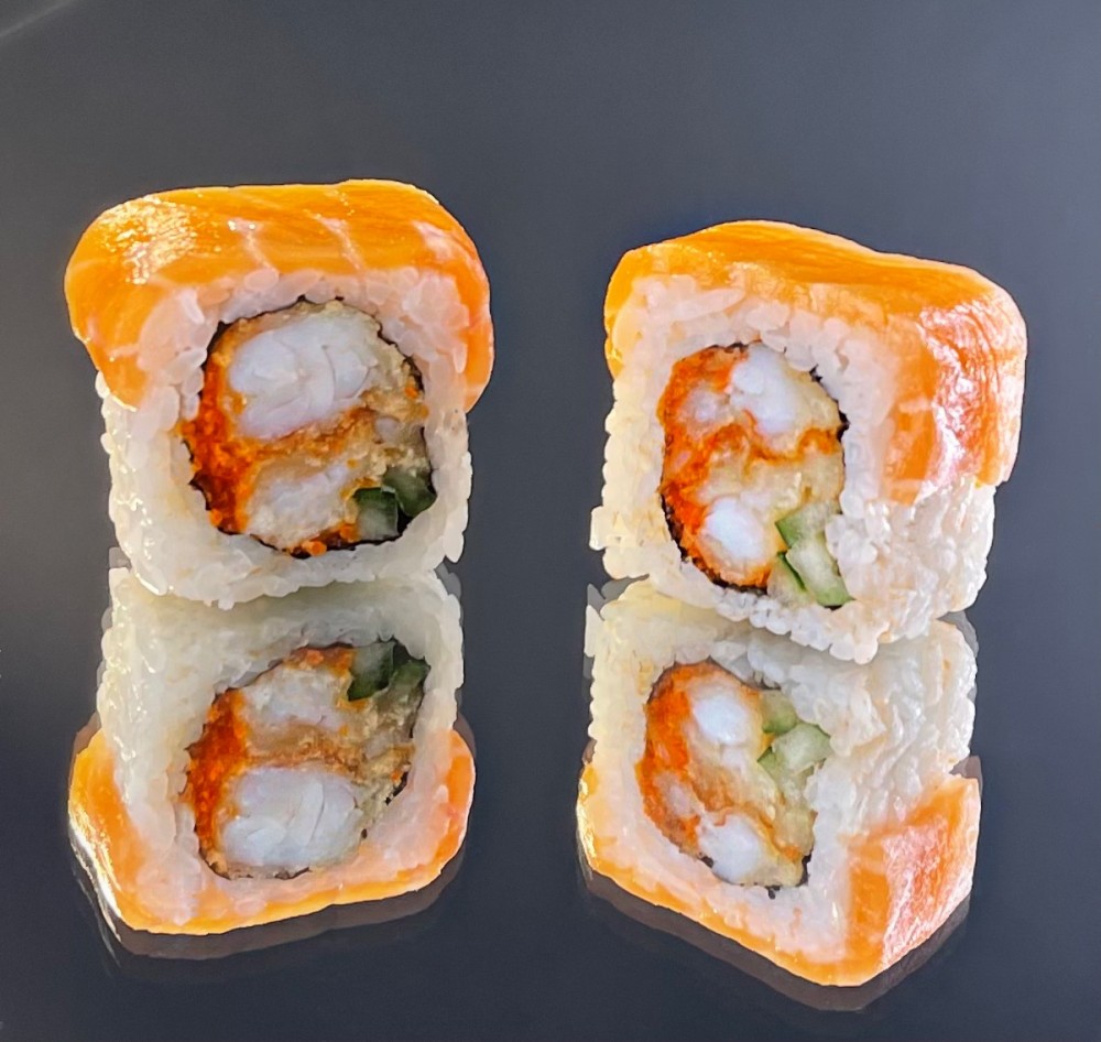 Рис, нори, филе Лосося, Тигровые Креветки темпура, белый японский соус, икра Масаго, свежий огурчик.