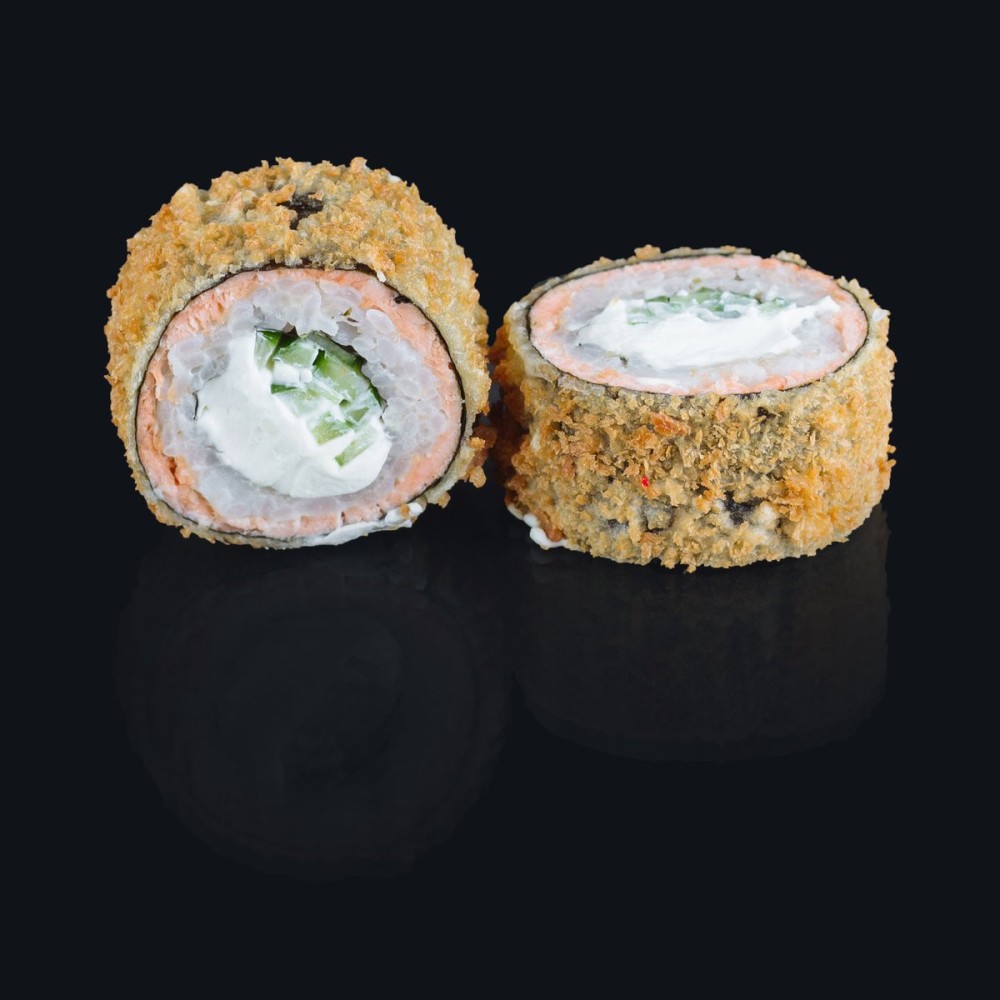 Рис, нори, сливочный сыр, свежий огурчик, филе Лосося по кругу, хрустящая панировка.