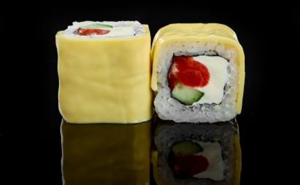 Рис, нори, филе копченого Лосося, сливочный сыр, свежий огурчик, сыр Хохланд.