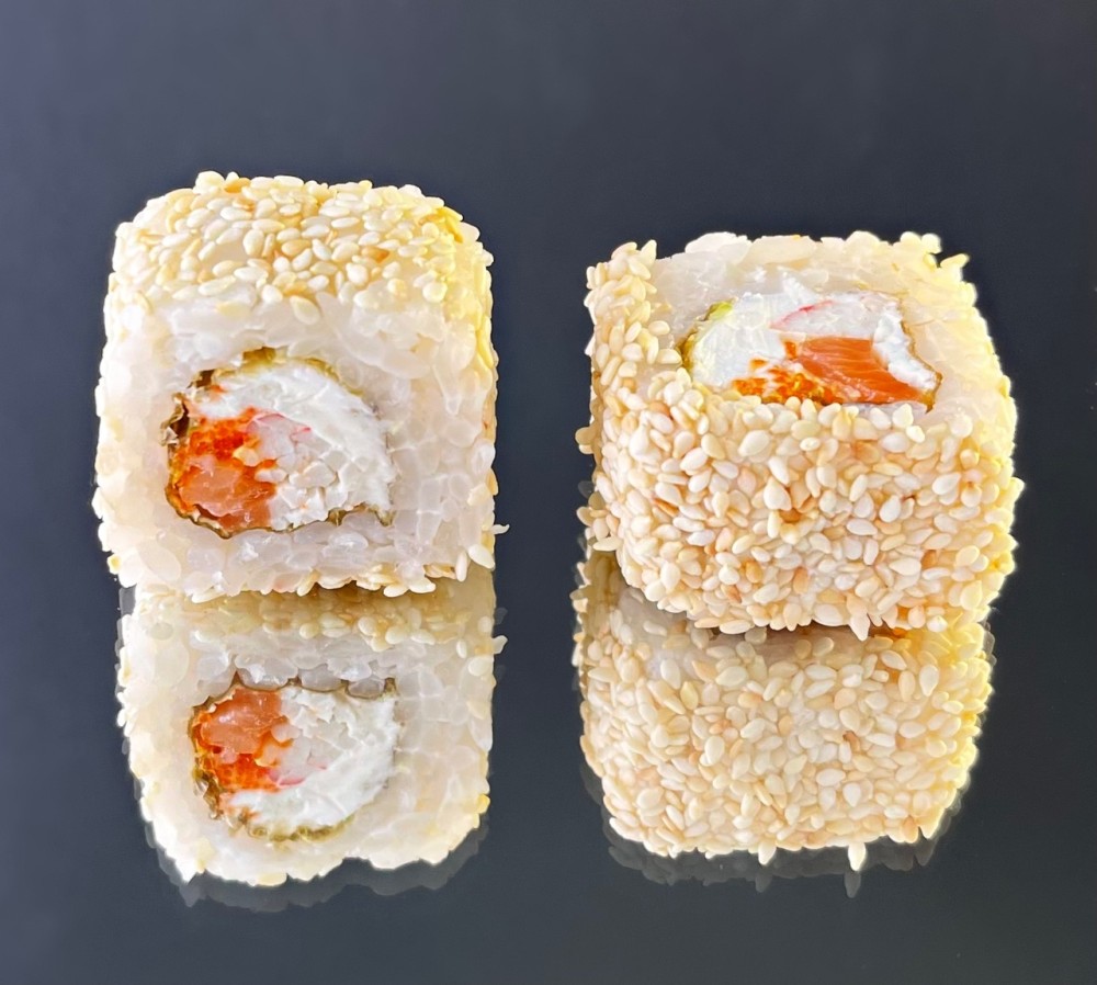 Рис, нори, филе Лосося, сливочный сыр, Снежный краб, икра Масаго, семя кунжута.