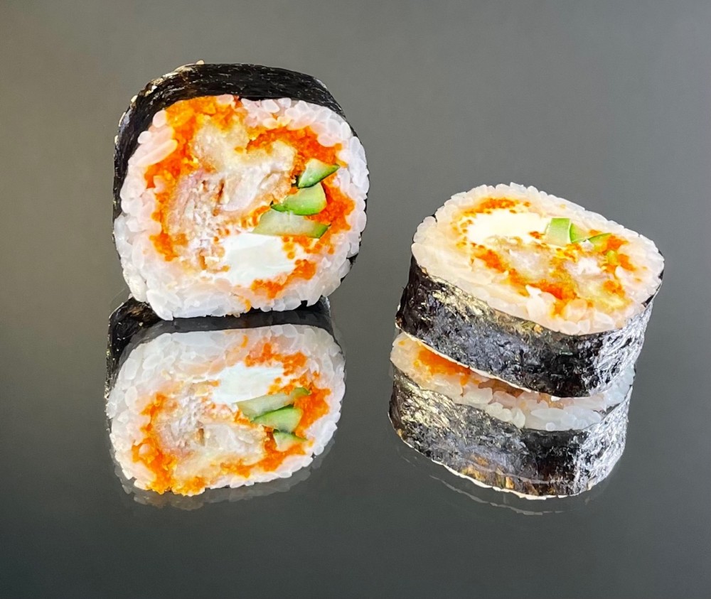 Рис, Тигровые Креветки темпура, сливочный сыр, свежий огурчик, икра Масаго по кругу, нори.