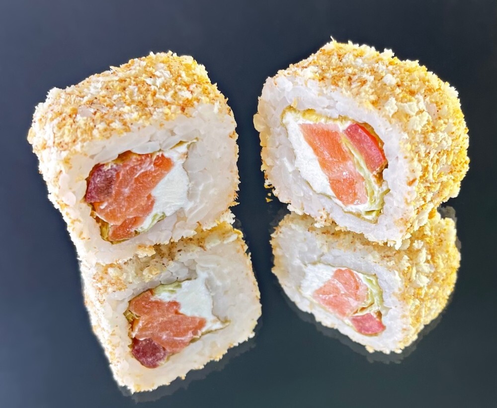 Рис, нори, фи ле Лосося, сливочный сыр, сочный помидор, mix салата, сухари Панко.