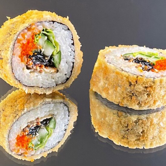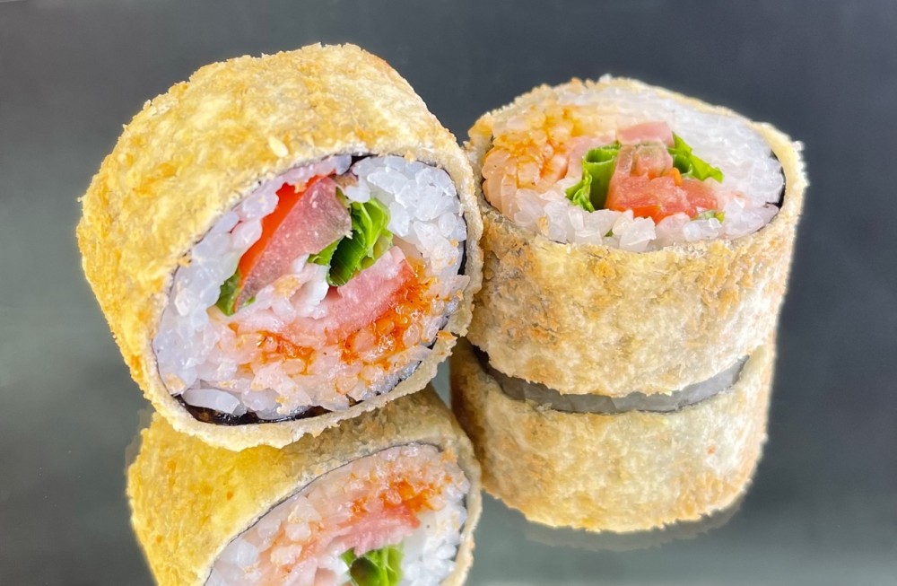 Рис,нори, копченый бекон, соус Спайси, зеленый лучок, сочный помидор, mix салата, хрустящая панировка.